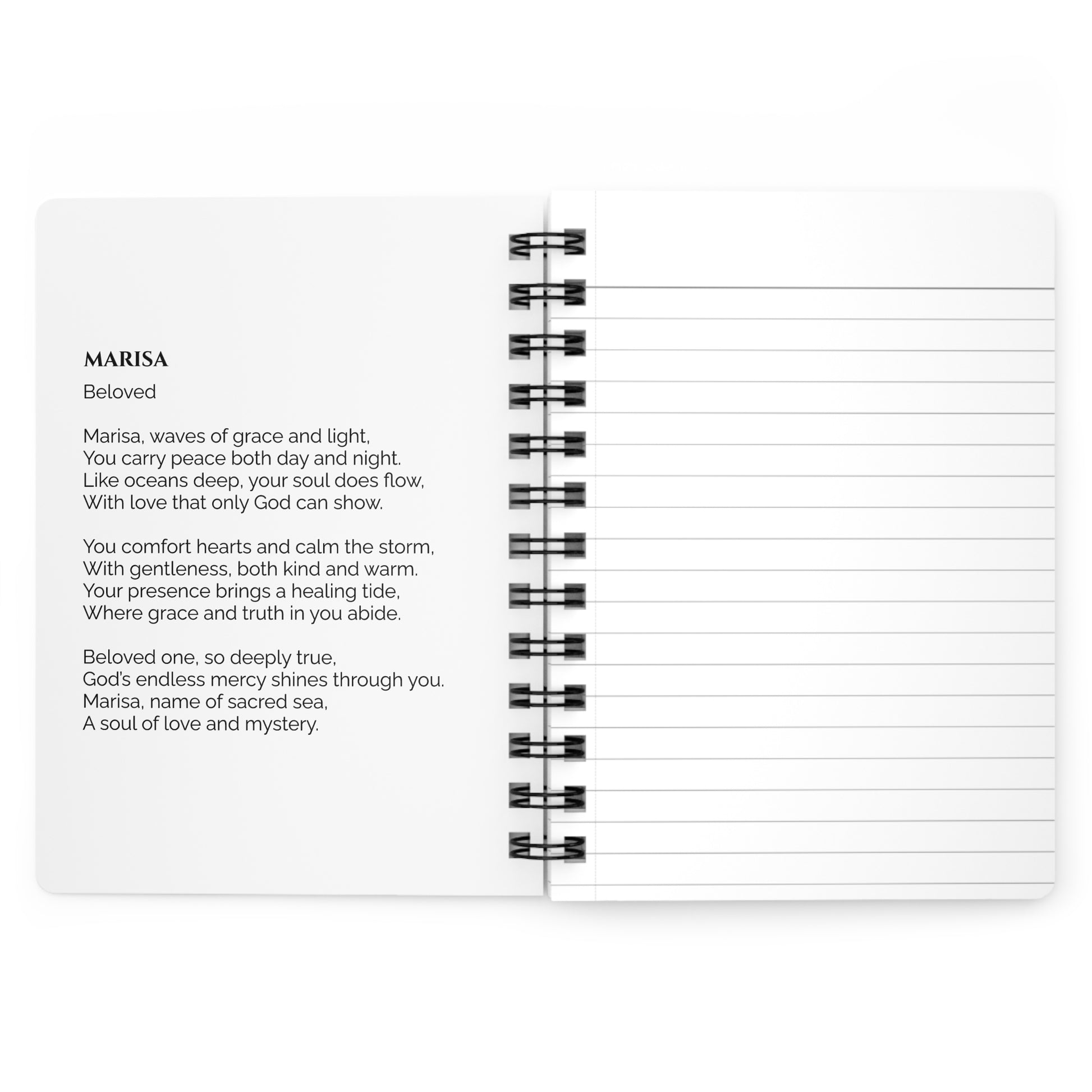 Elegant and minimalistic spiral bound journal with the spiritual and symbolic Name Meaning printed on the cover and a customized Name Meaning Poem printed on the inside cover. Perfect for writing and keeping track of your thoughts, this journal adds a personal touch to your daily routine. Ideal for those who value personalized stationery and make great gift options for birthdays, holidays, and special occasions.